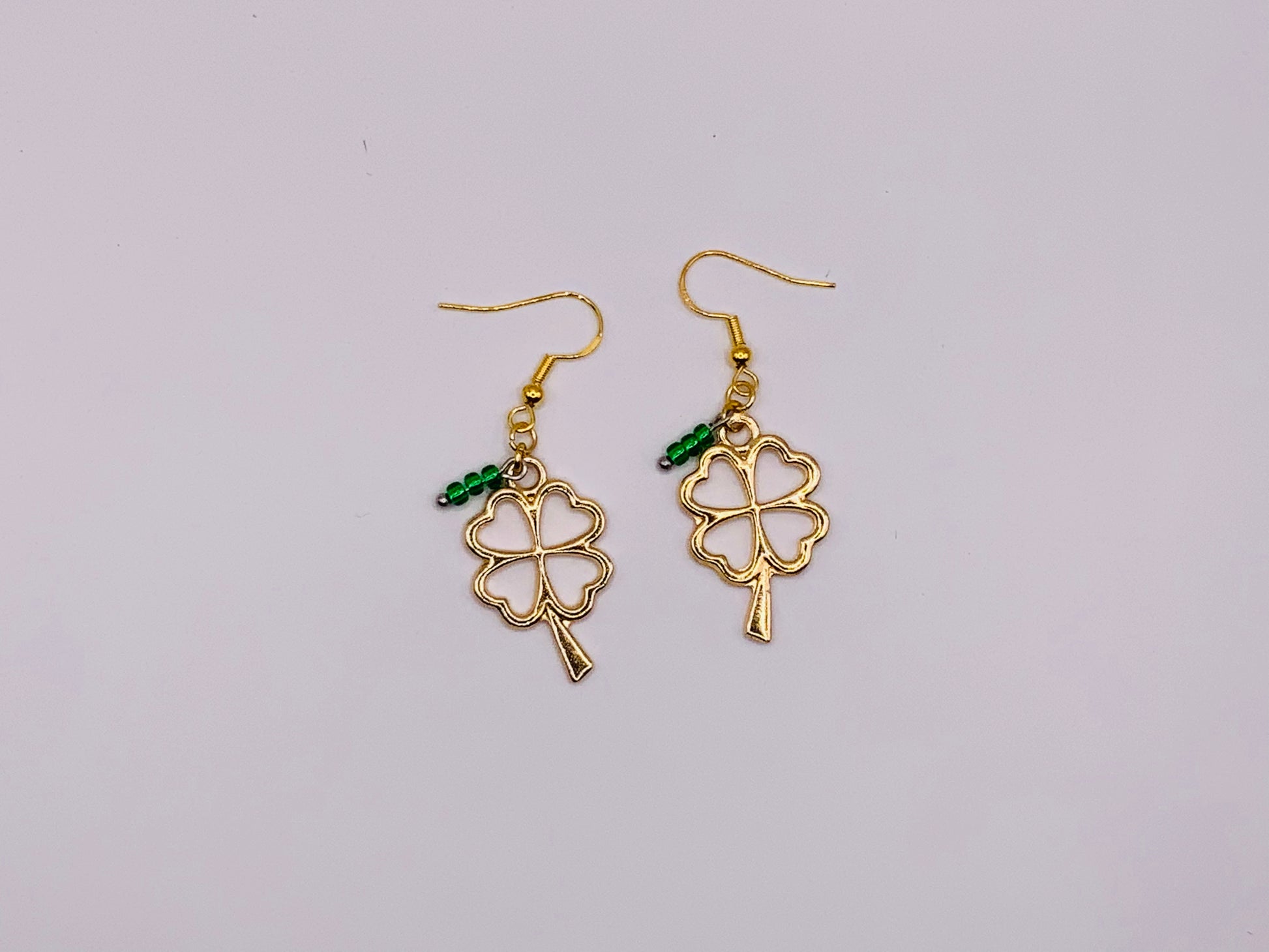 Gold-tone 4 Leaf Clover earrings, hypoallergenic ear wires.  Embellished with green beads.