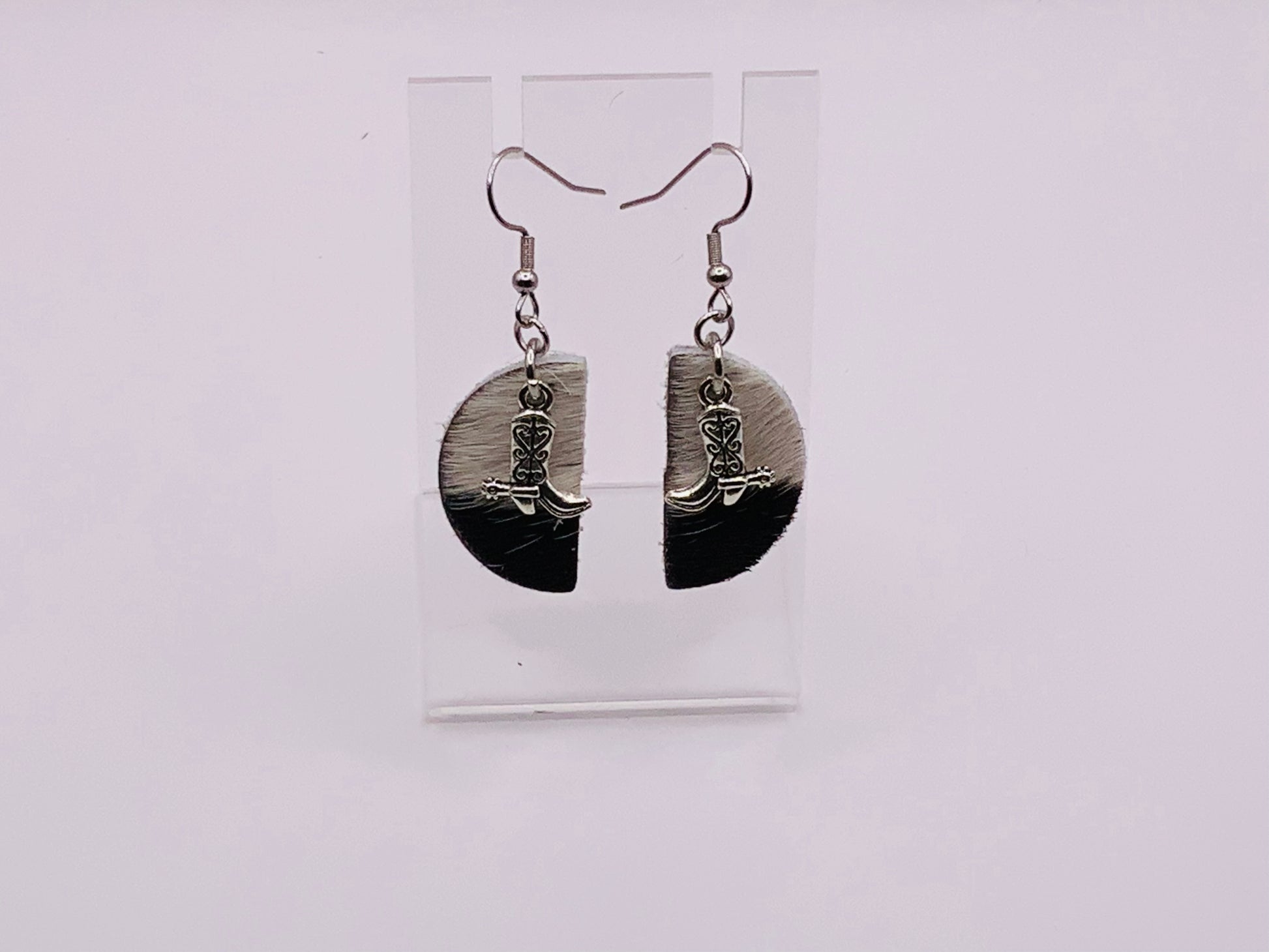 Hair on Hide black and white earrings, embellished with cowgirl boots!