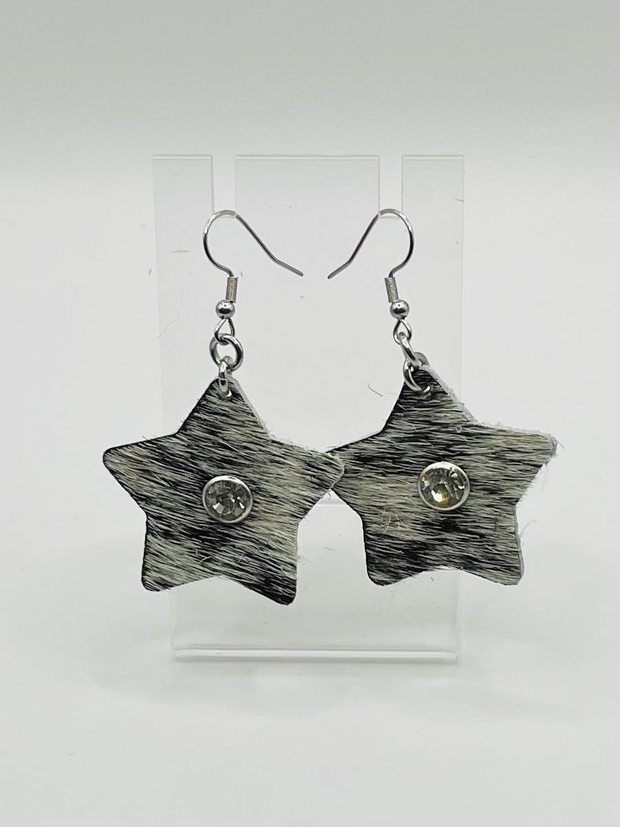 Star shaped hair on hide earrings, embellished with a clear crystal rivet.