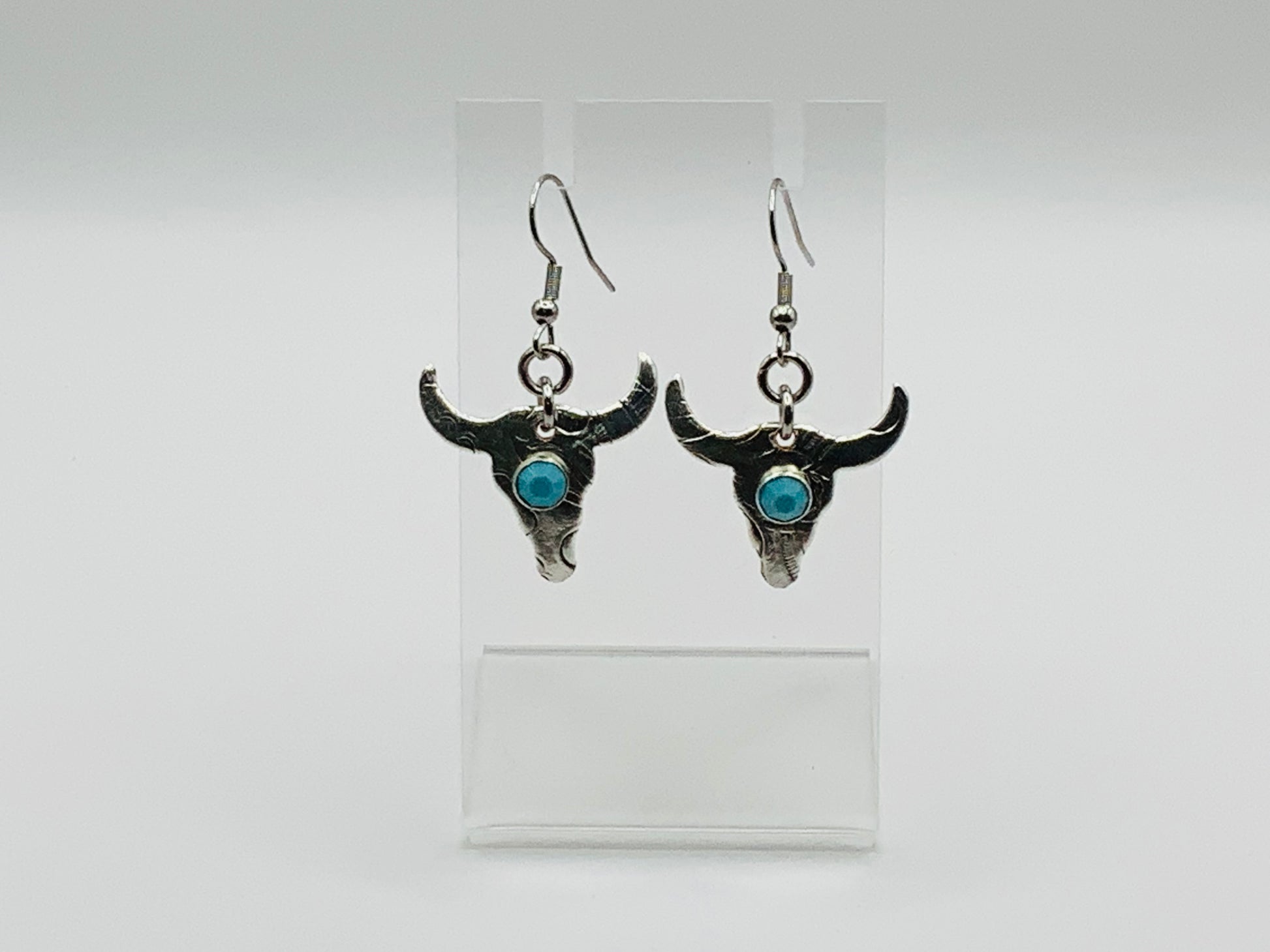 Longhorn steer earrings, embellished with a light turquoise colored rivet.  Made from antique vintage silver plated serving trays and platters.