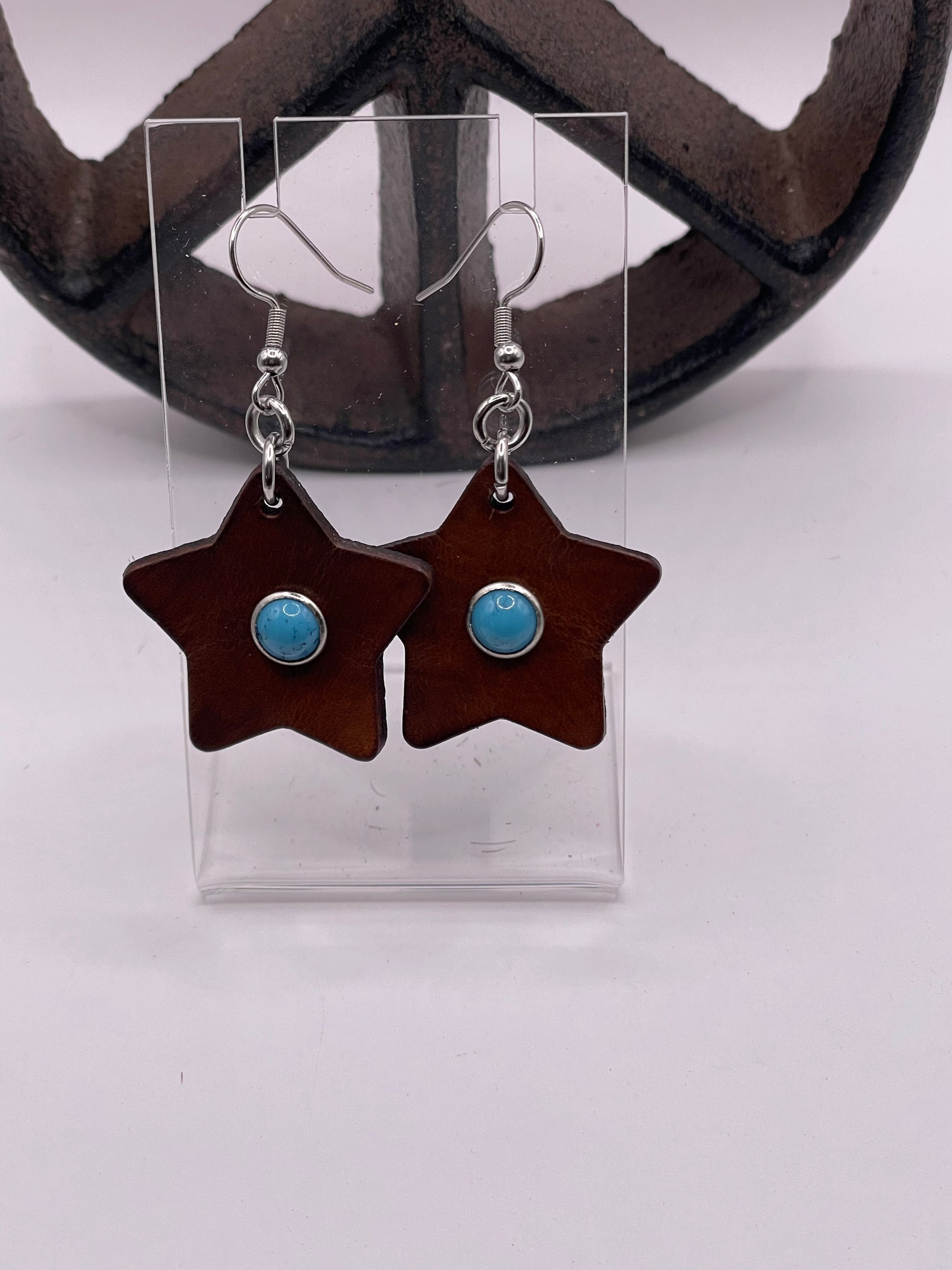 Star shaped earrings, hand cut and dyed medium brown, conditioned. Embellished with a turquoise color stone.