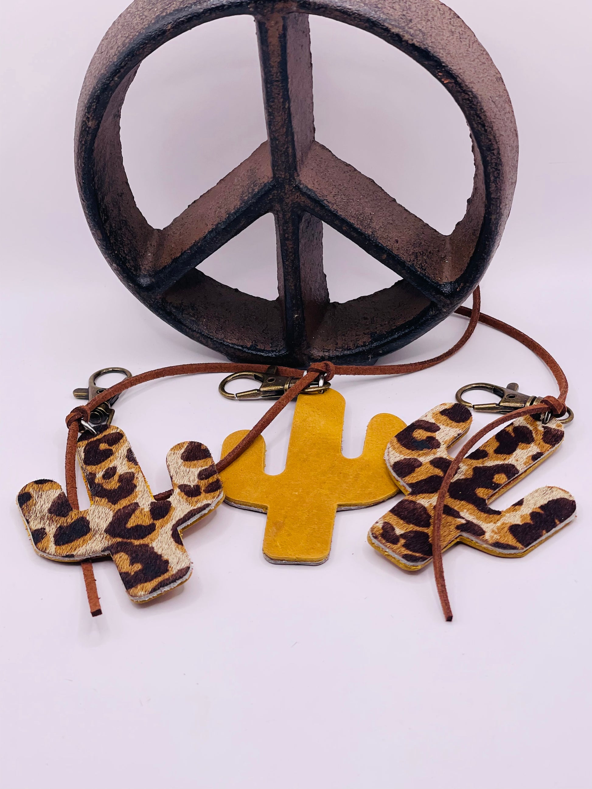 Specialty Hair on Hide Leather cactus shaped bag tag for a purse or as a keychain. This piece has smooth gold leather on one side and a beautiful hand stamped animal print hair on hide leather on the opposite side!