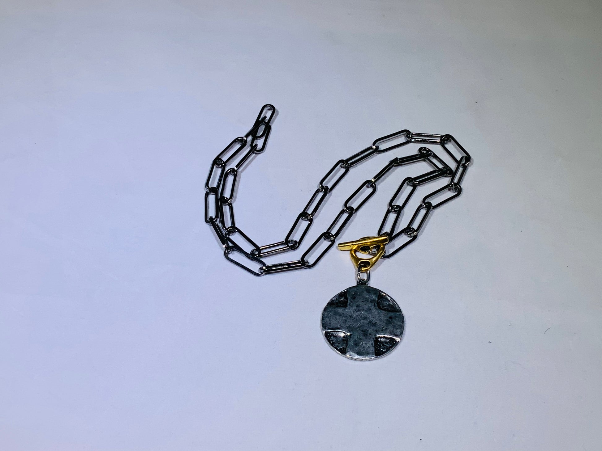 Antiqued dark patina colored vintage cross medallion with gunmetal color paperclip chain link, gold toggle clasp closure. The reverse side of the cross has The Lord’s Prayer.