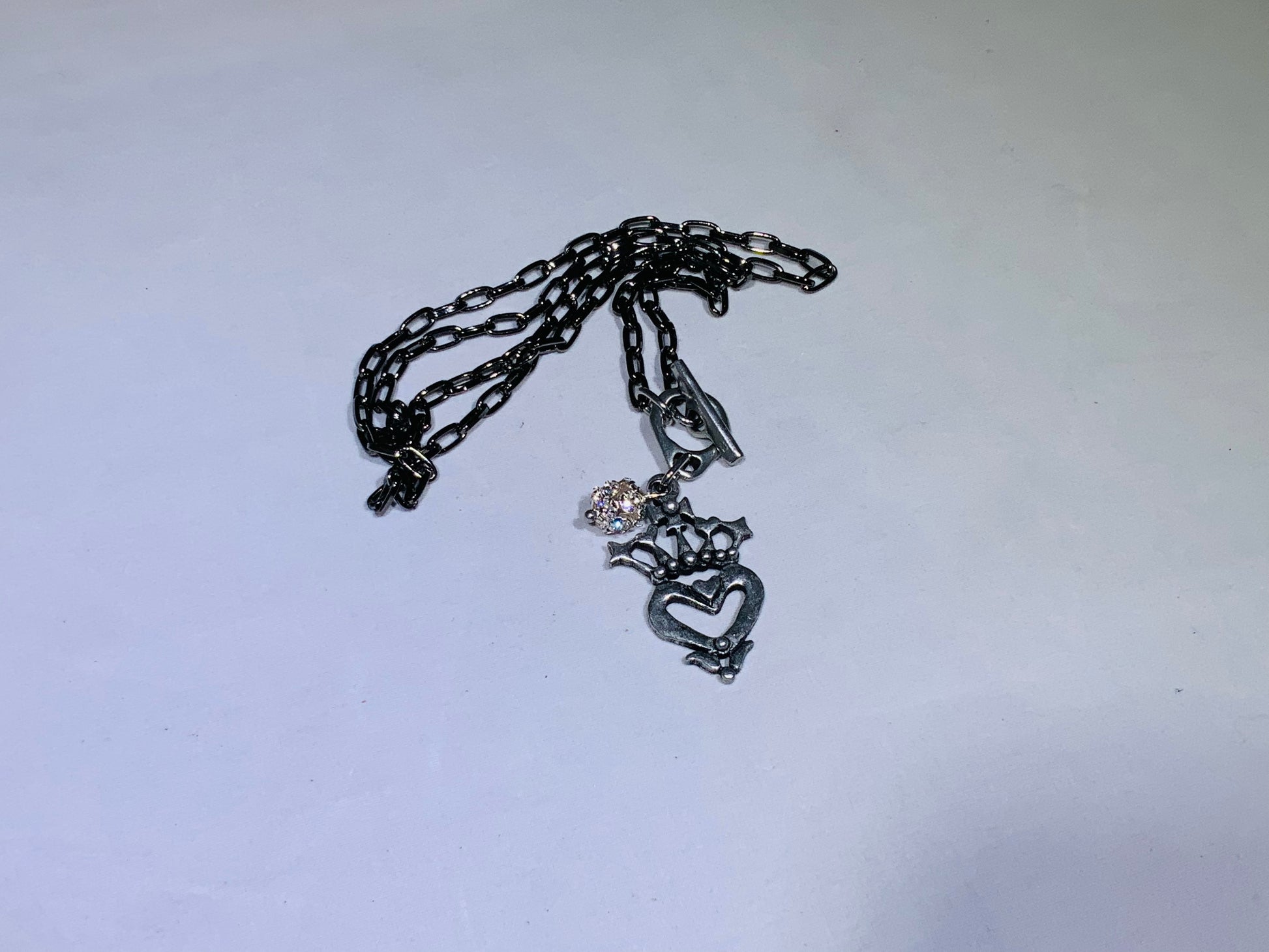 Very stylish antiqued silver heart crown accented with a Swarovski crystal bead, Toggle clasp closure and gunmetal link chain.