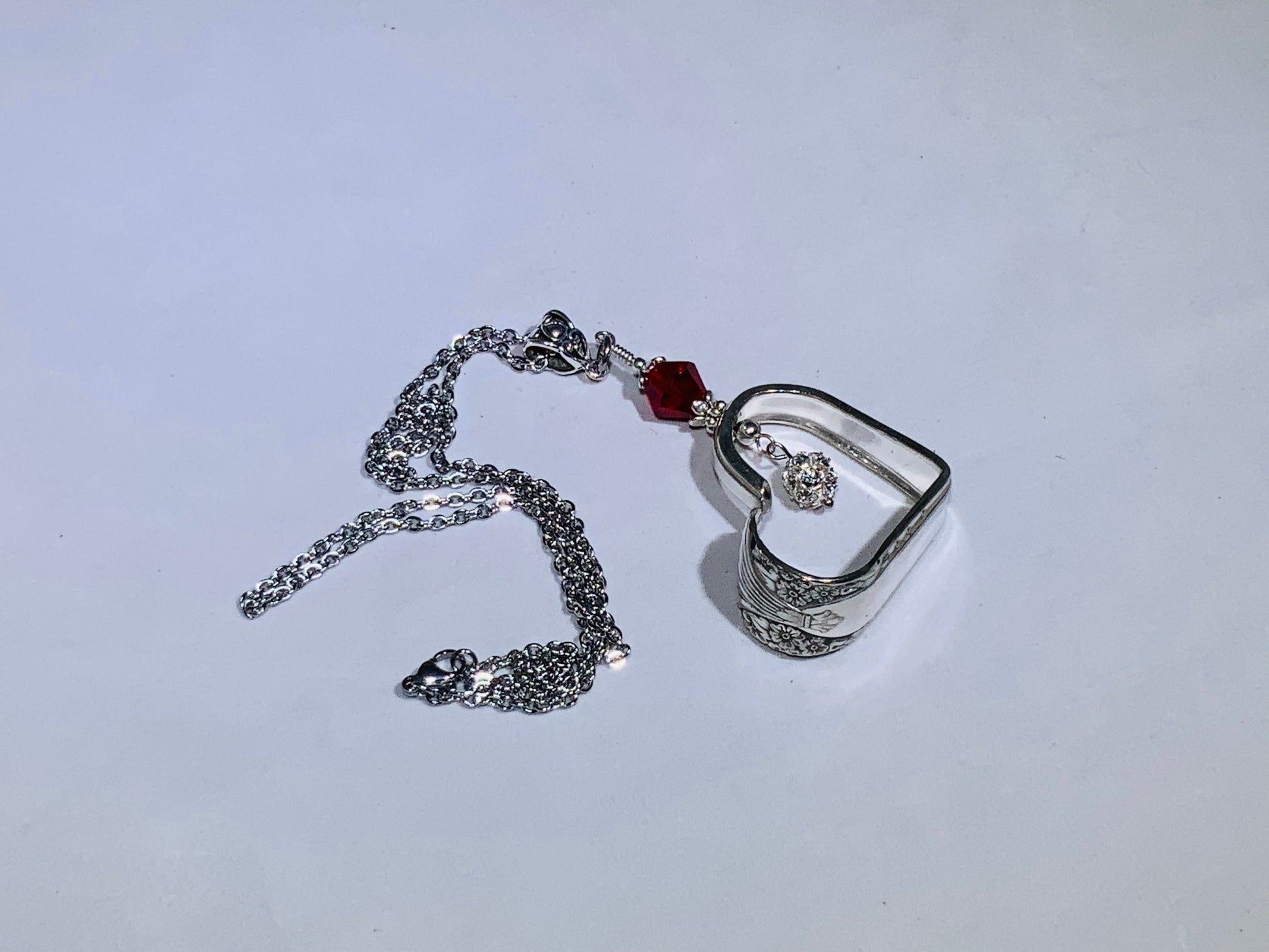 Floating Heart antique vintage silver plated silverware necklace.  Denebi’s number one selling necklace!  Embellished with beads or pearls.