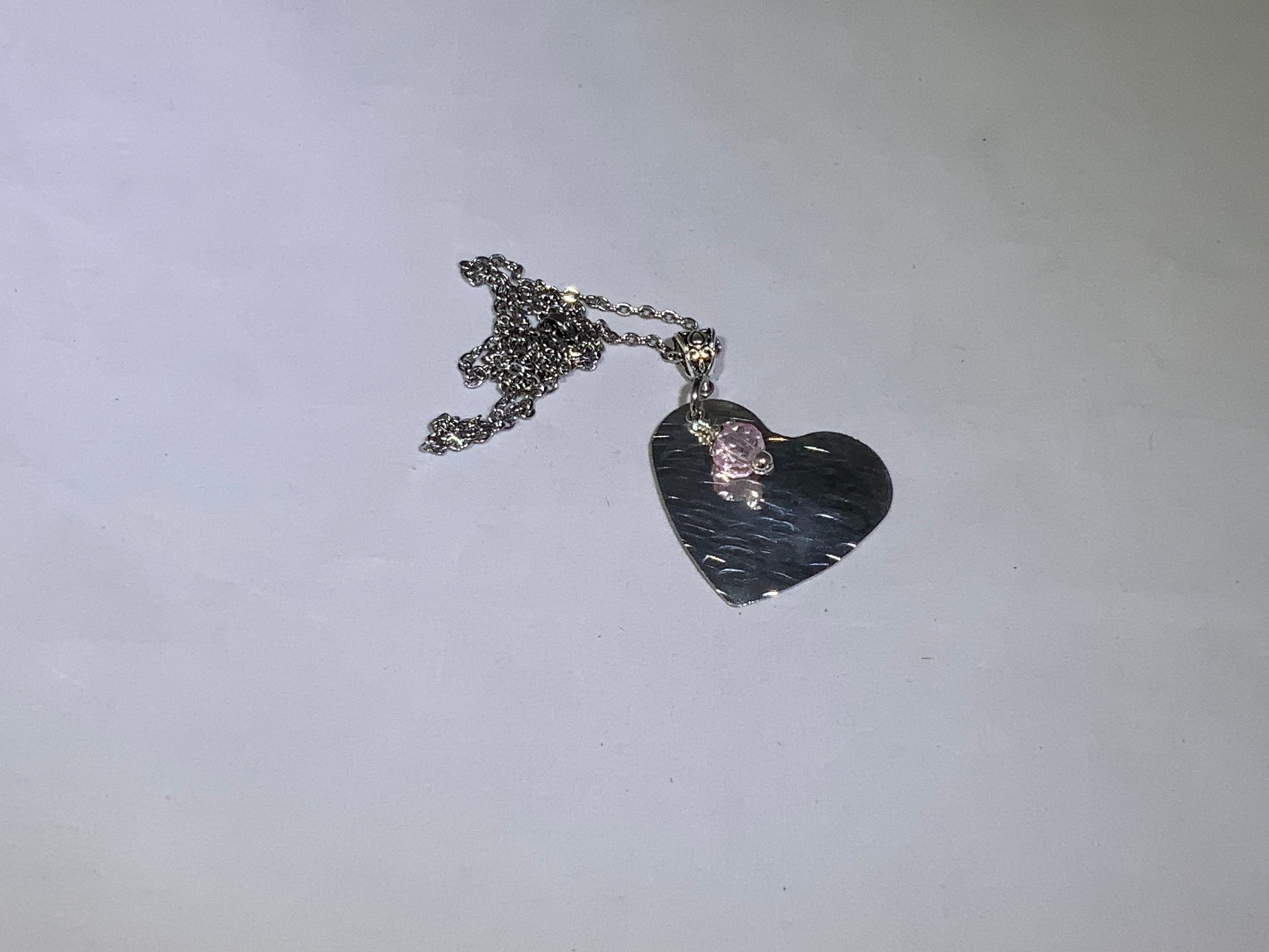 Heart pendant necklace made from an antique vintage silver plated spoon bowl, embellished with a pink iridescent bead. Textured hammer design finish and 1 3/4 width.