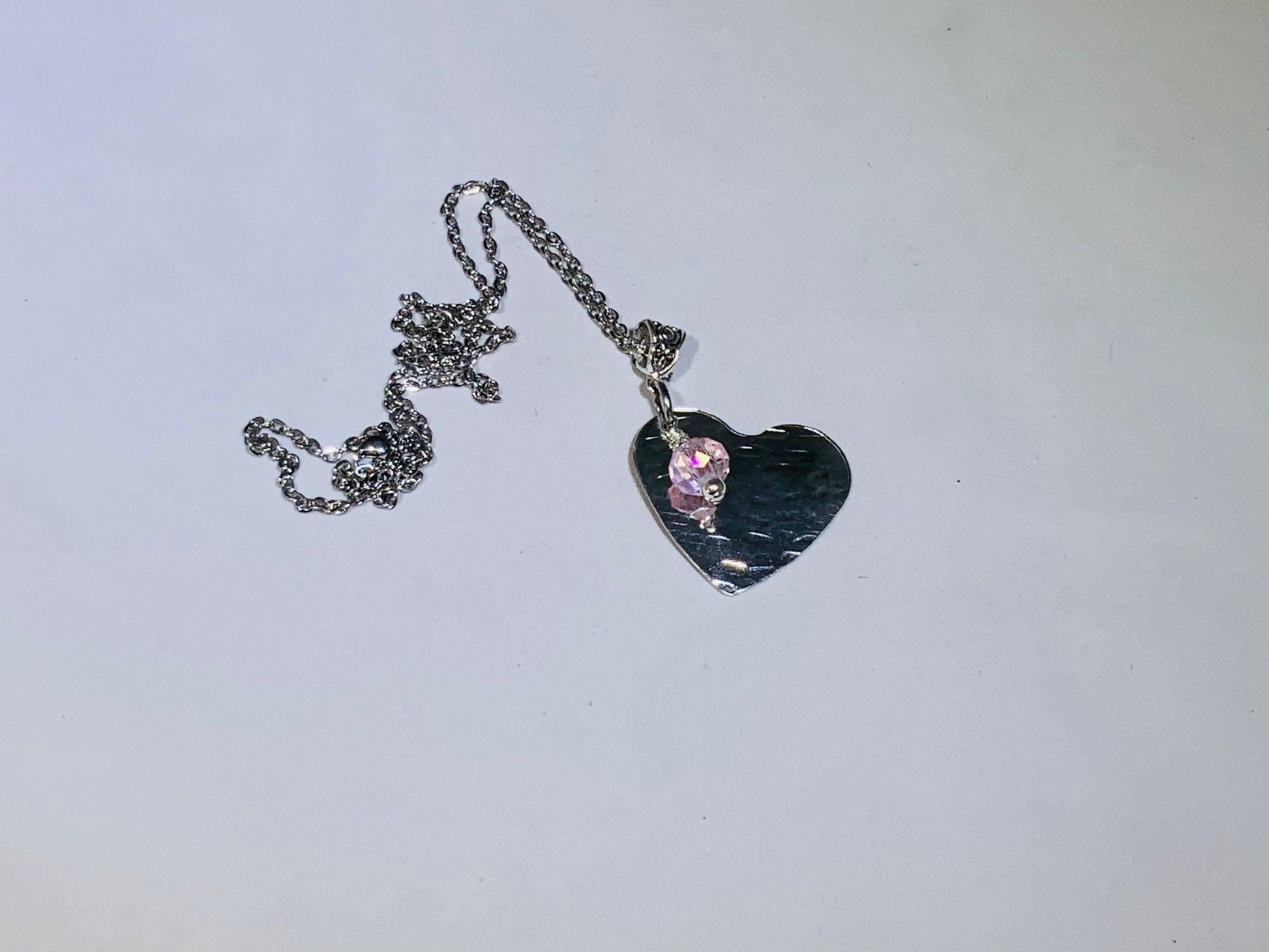 Heart pendant necklace made from an antique vintage silver plated spoon bowl, embellished with a pink iridescent bead. Textured hammer design finish and 1 1/2” width.