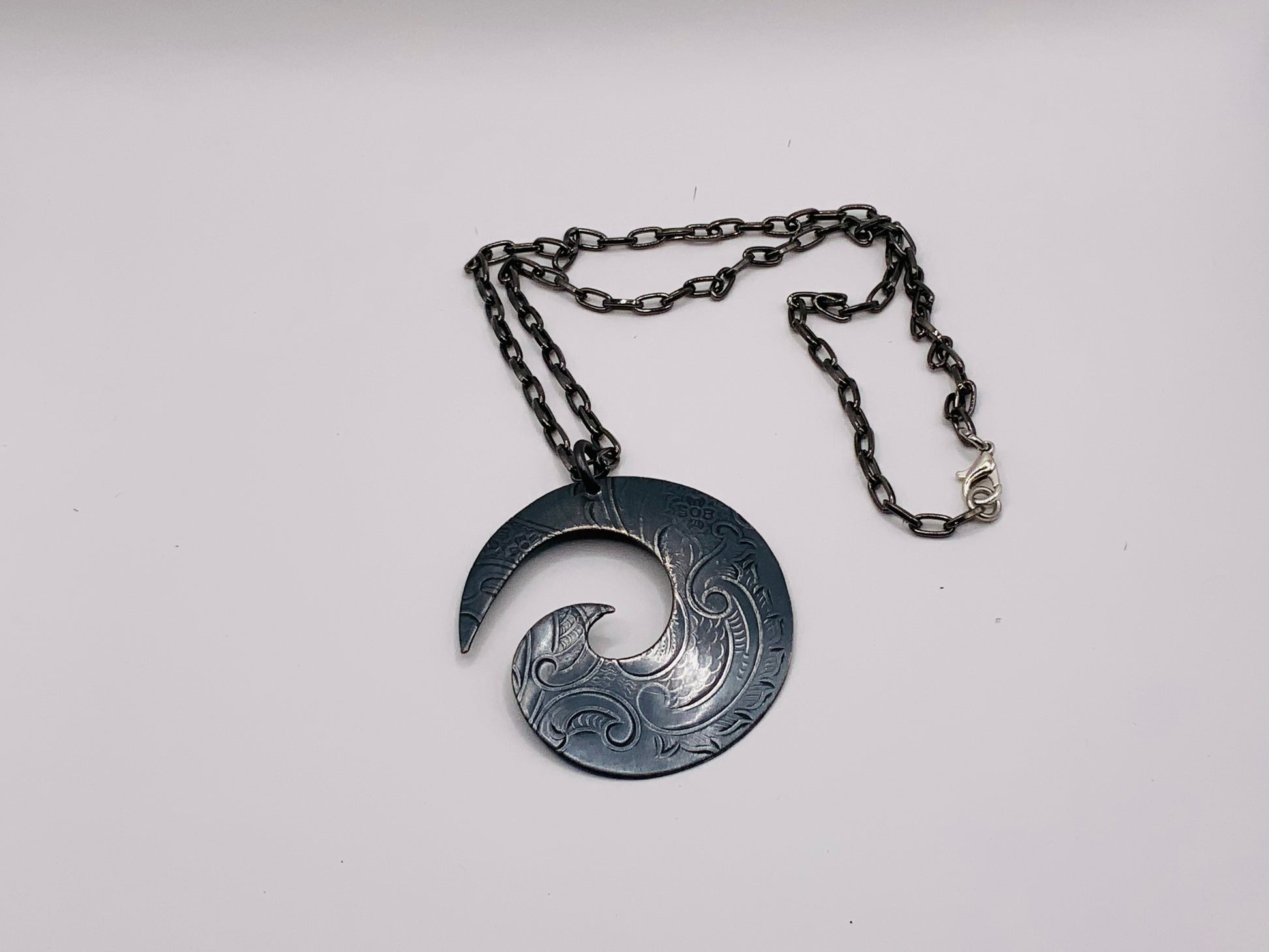 Dark patina finish Swirl necklace on a gunmetal chain, approximately 18” choker style length with clasp.  Made from antique vintage silver plated platters and trays.