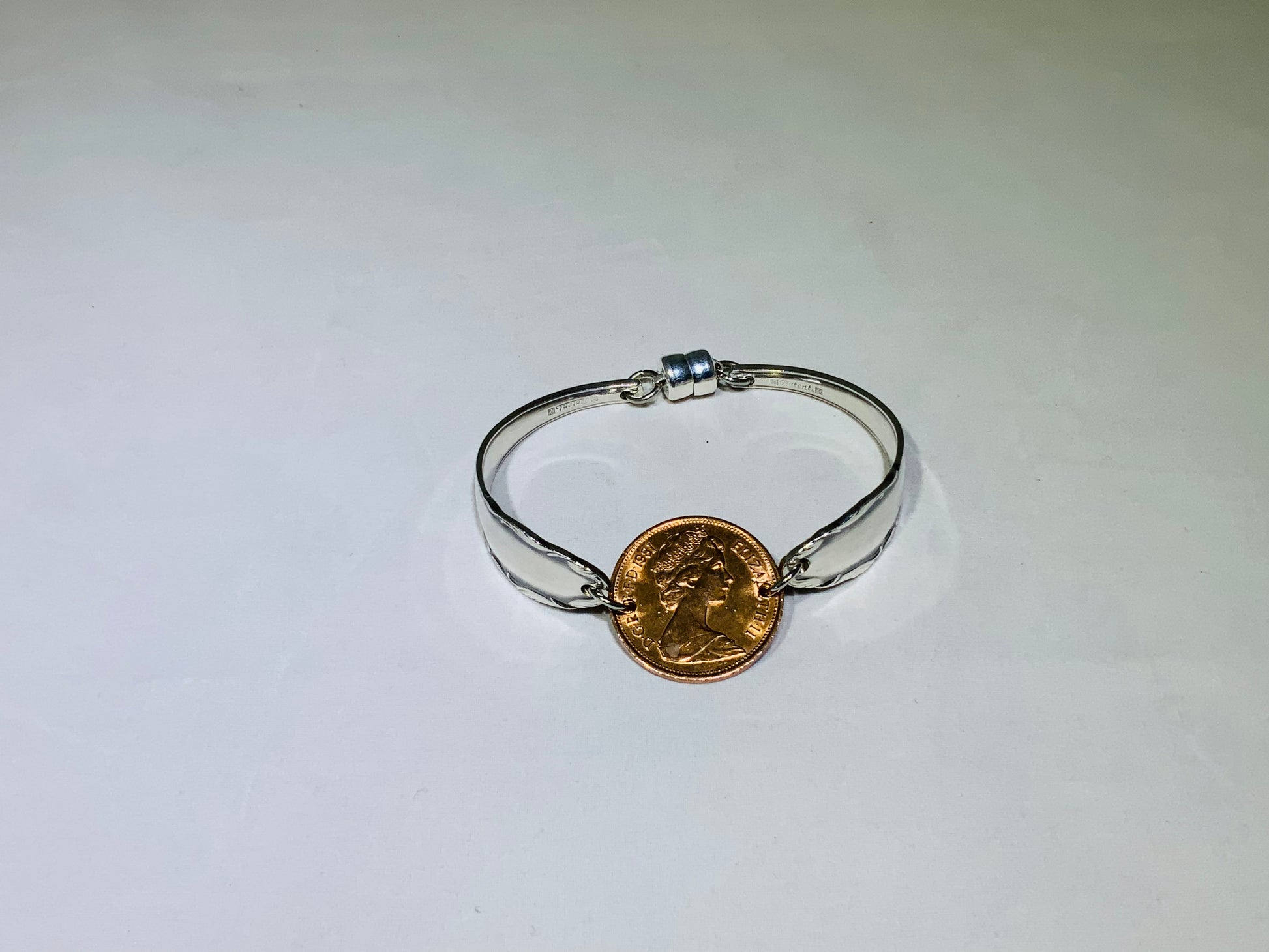 Antique vintage silver plated bracelet. Accented with Two Pence Queen Elizabeth coin. Size Large.
