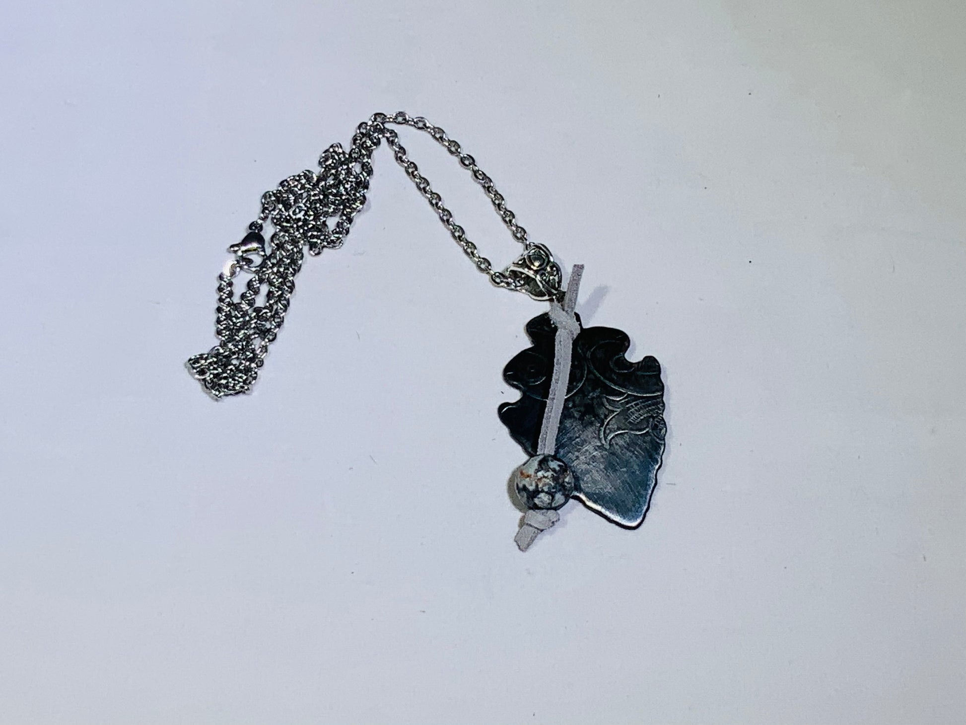 Arrowheads made from antique vintage silver plated serving trays and platters.  Patina finish with a gray leather tie and beautiful agate stone.