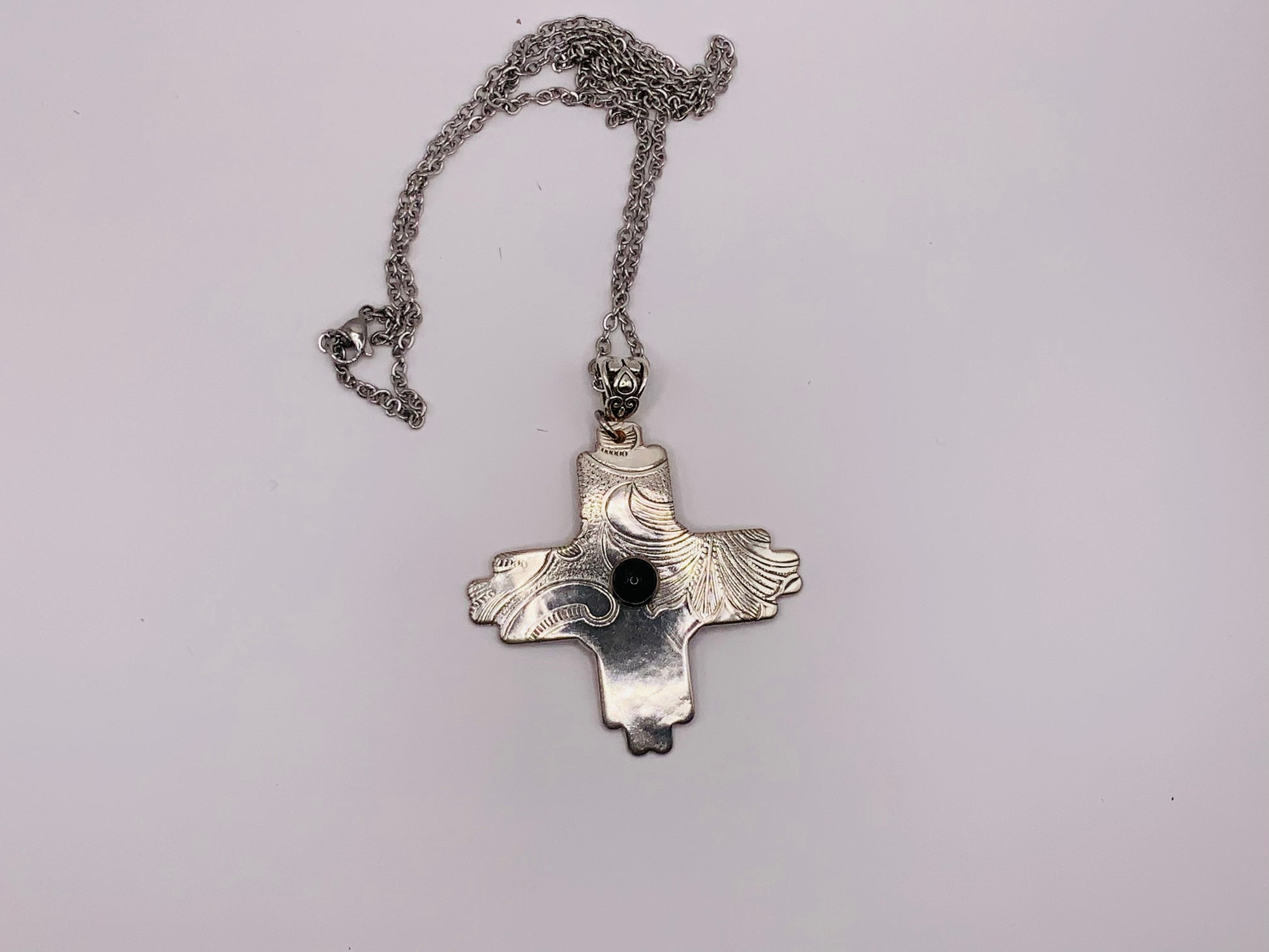 Southwest cross accented with a black colored rivet.  Made from antique vintage silver plated serving platters and trays.  Color is silver, no patina finish, with a 24” stainless steel necklace.