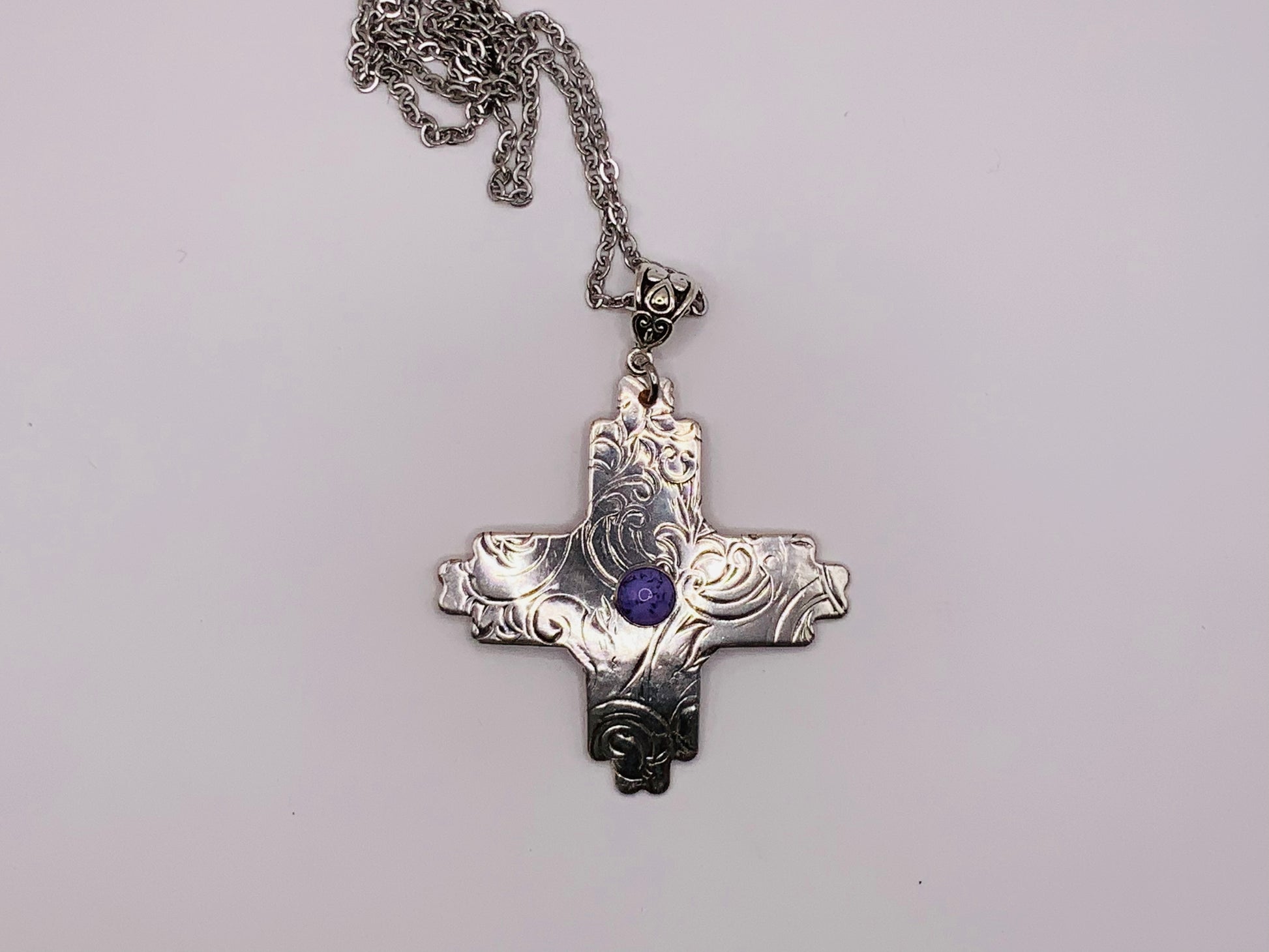 Southwest cross accented with a purple colored rivet.  Made from antique vintage silver plated serving platters and trays.  Color is silver, no patina finish, with a 24” stainless steel necklace.