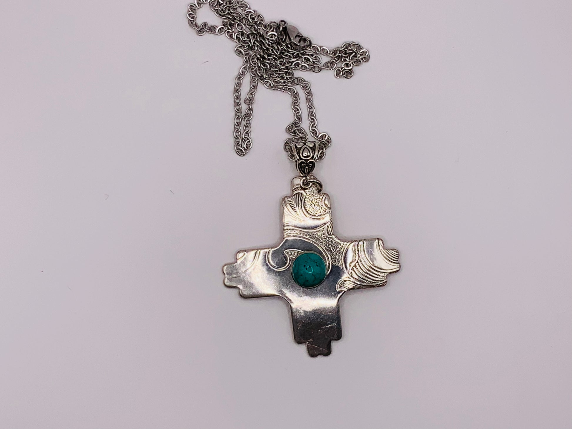 Southwest cross accented with a large green turquoise colored rivet.  Made from antique vintage silver plated serving platters and trays.  Color is silver, no patina finish, with a 24” stainless steel necklace.