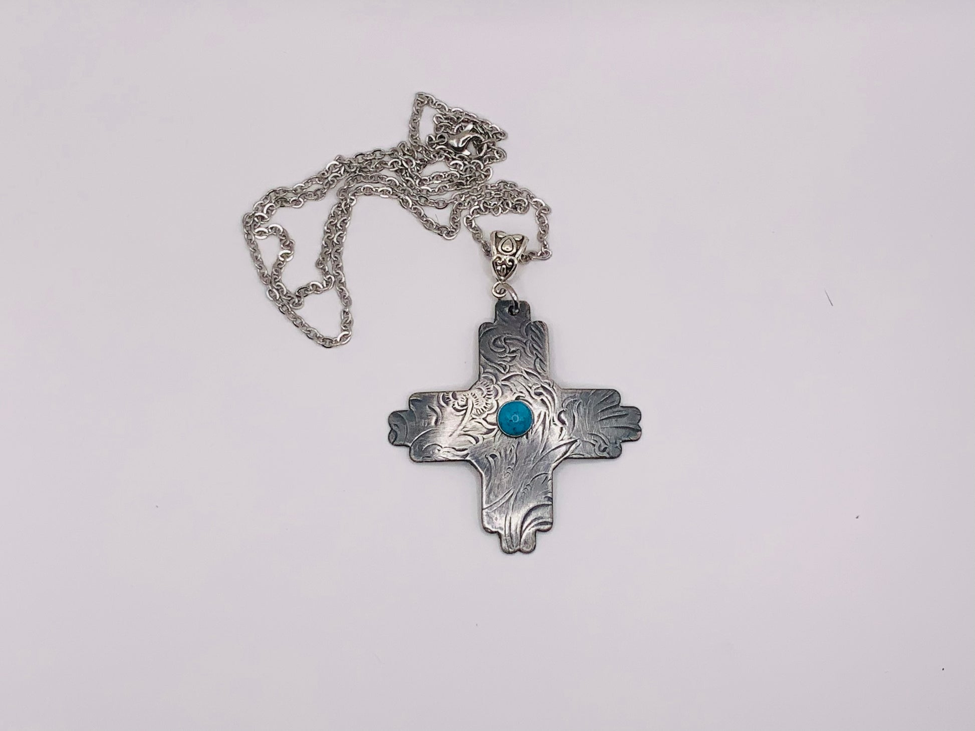 Southwest cross accented with a turquoise colored rivet.  Made from antique vintage silver plated serving platters and trays.  Patina finish, with a 24” stainless steel necklace.