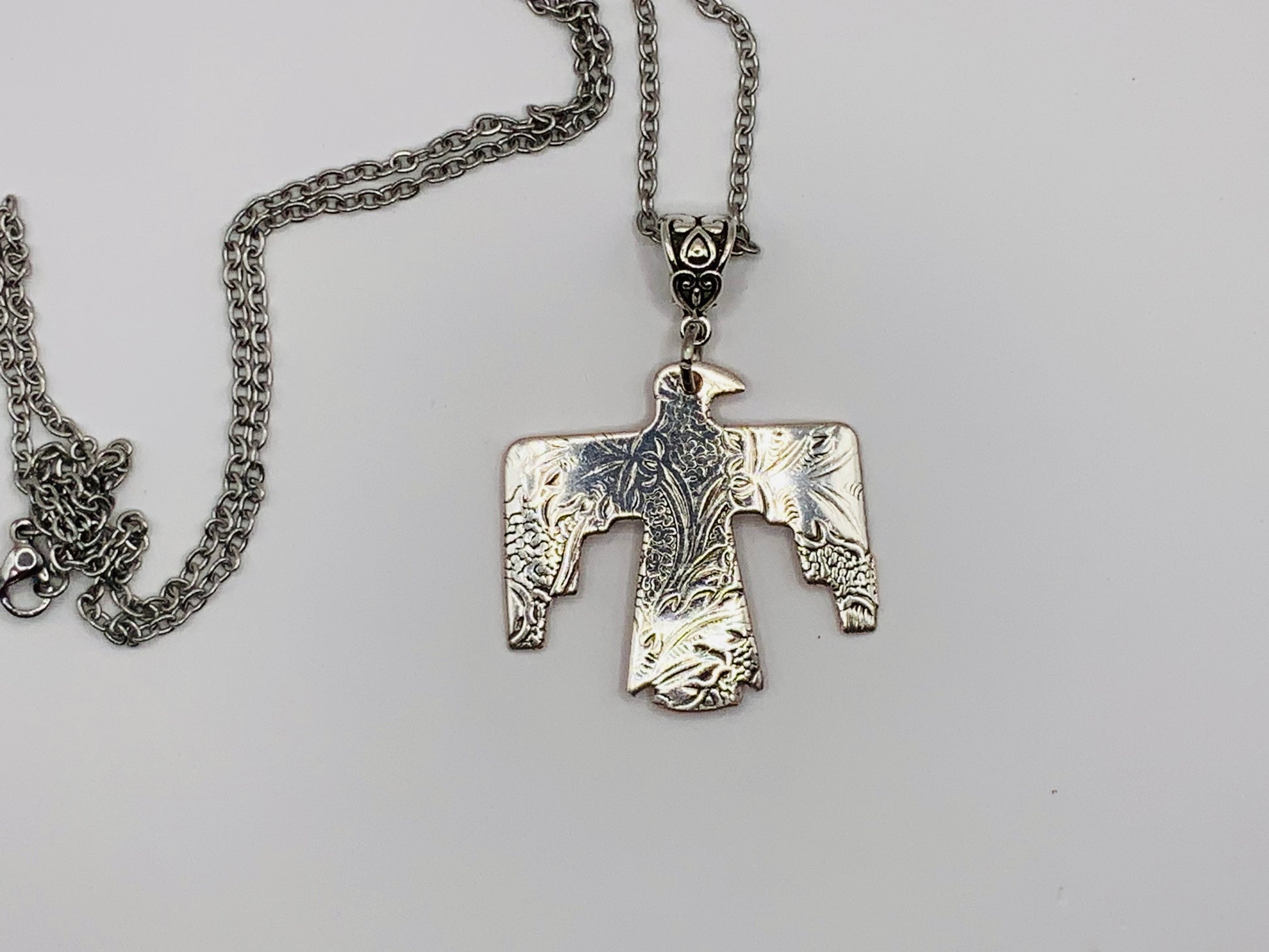 Small Thunderbird with plain silver finish.  Made from antique vintage silver plated platters and trays.