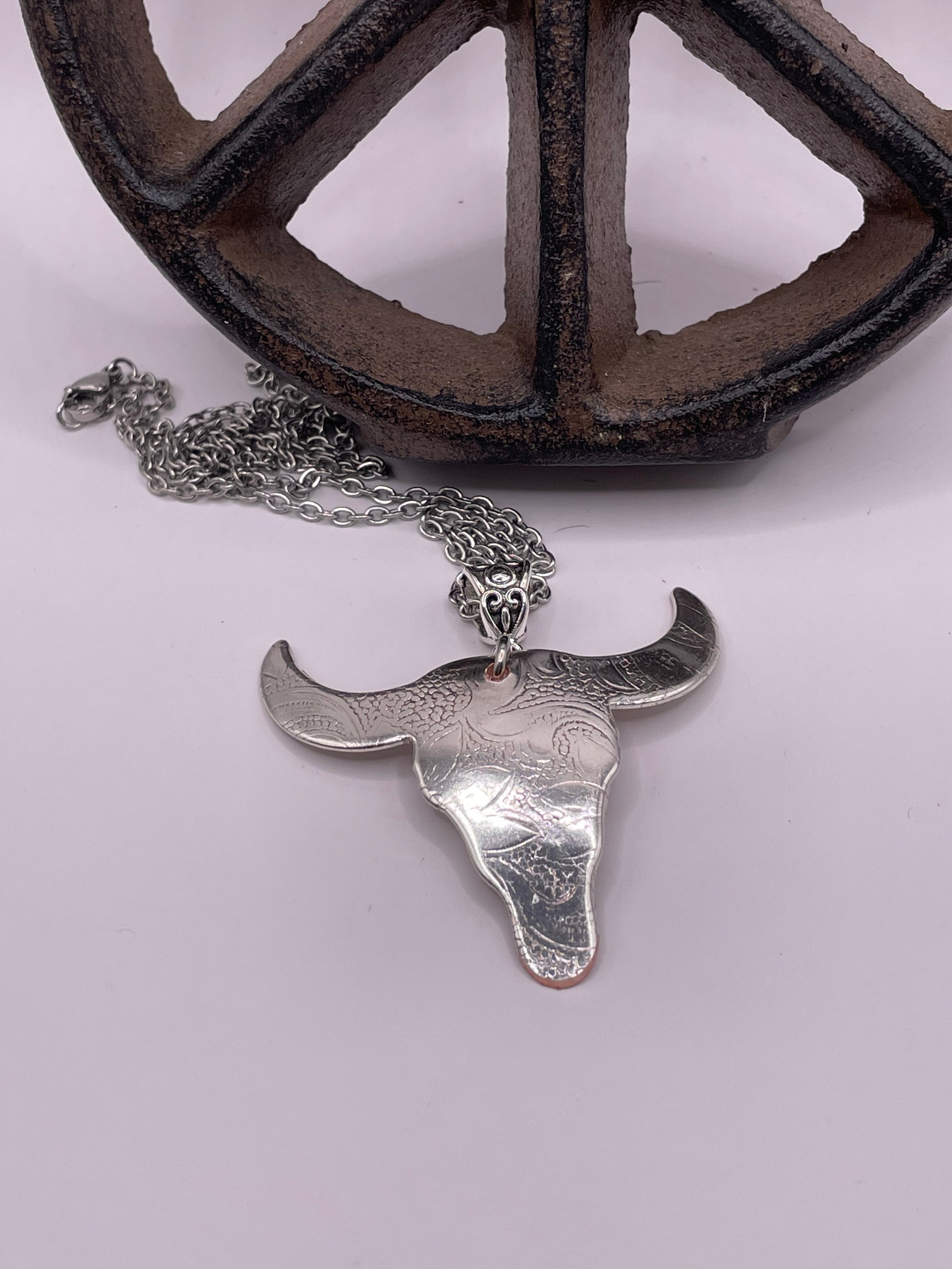 Longhorn head with plain silver finish.  Made from antique vintage silver plated platters and trays.